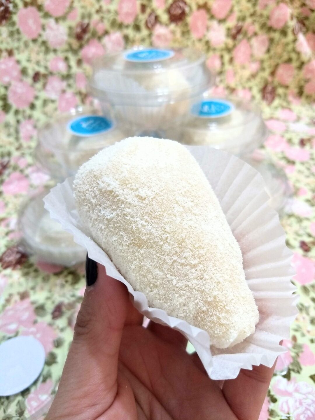 Brigadeiro de Ninho em forma de coxinha, recheado com morango fresco e coberto com leite Ninho em pó.